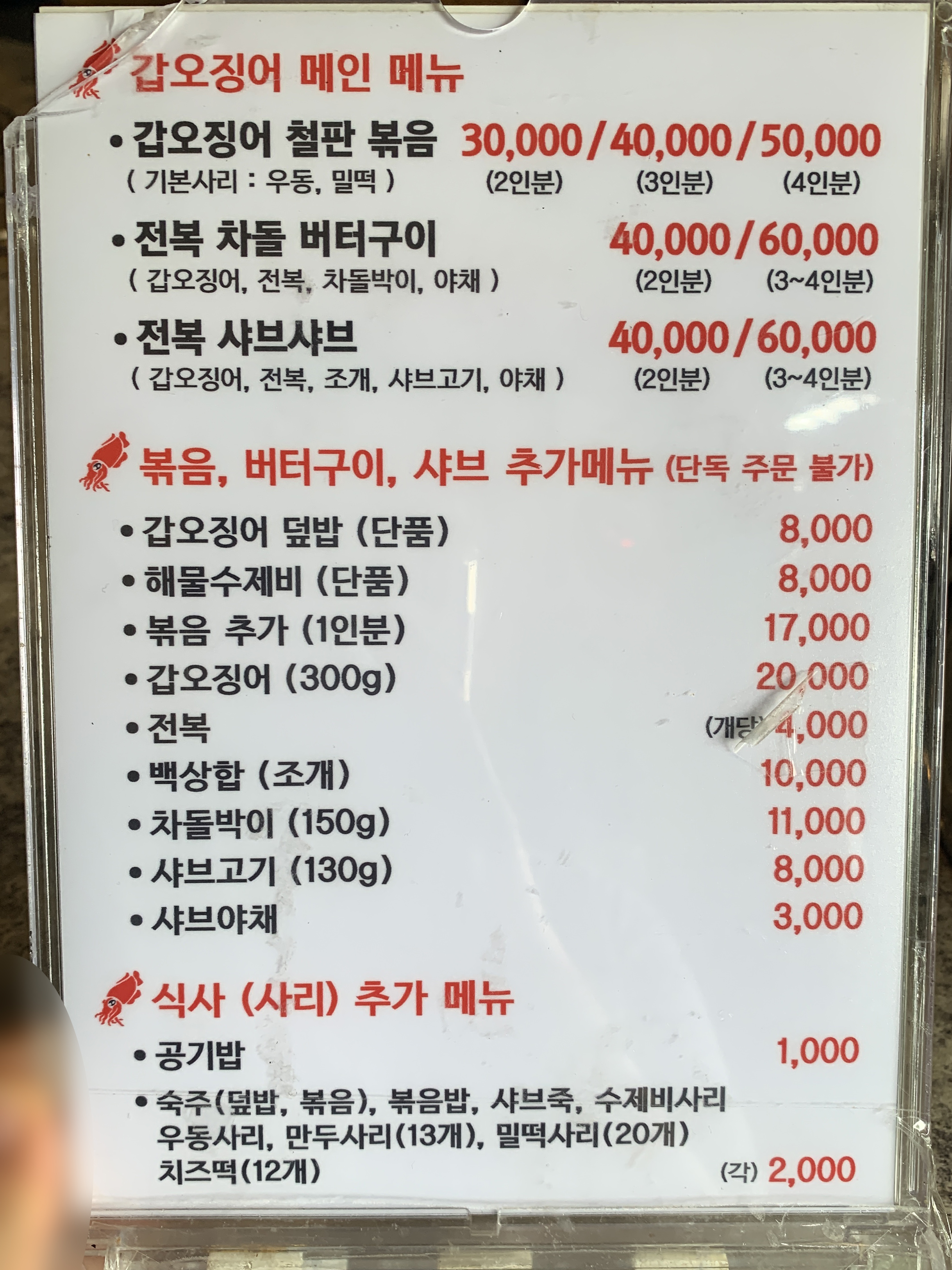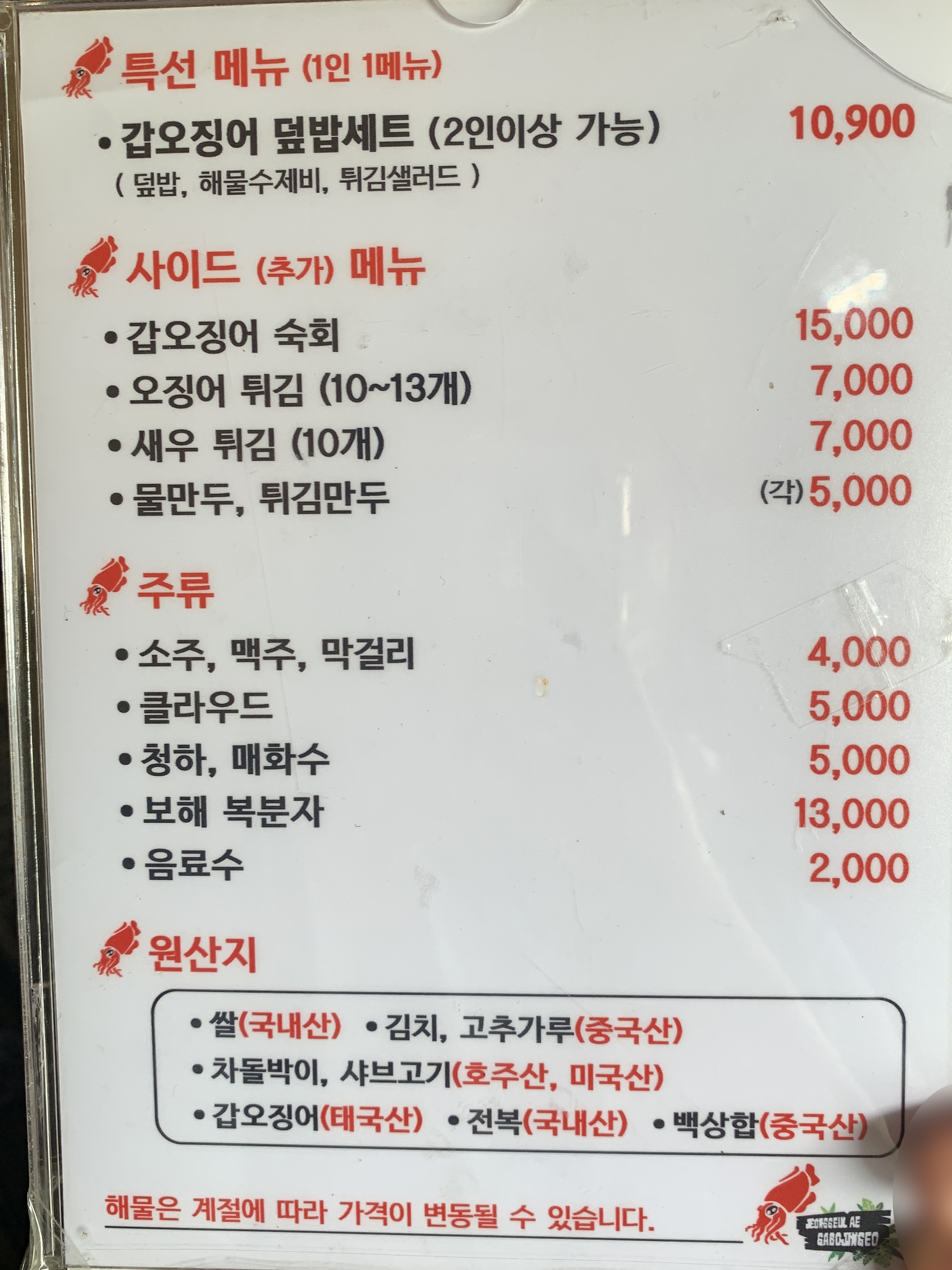 정글애 갑오징어 메뉴 및 가격표