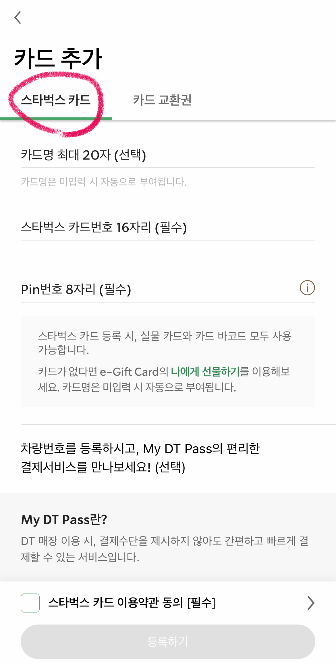 스타벅스 앱 내에서 같은 곳에 들어가서 등록하면 되기 때문에