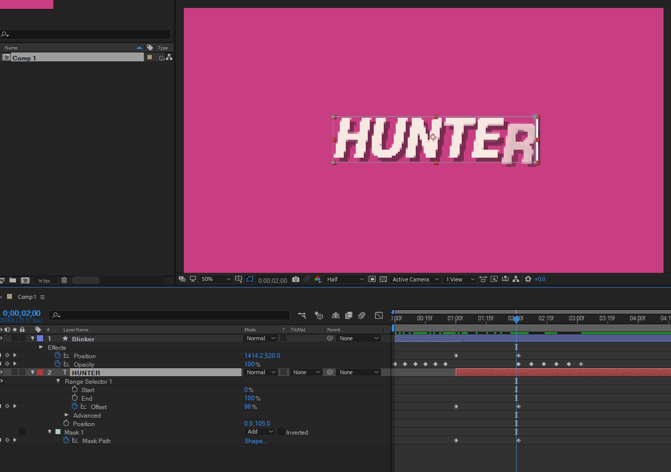 2) 텍스트에 마스크, 키프레임 애니메이션 생성