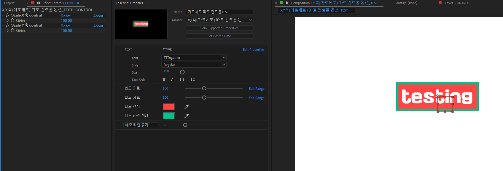 (하단 예제에서 글자 밑에 사각형의 x,y(가로 세로)를 각각 다른 슬라이드컨트롤에 연결해서