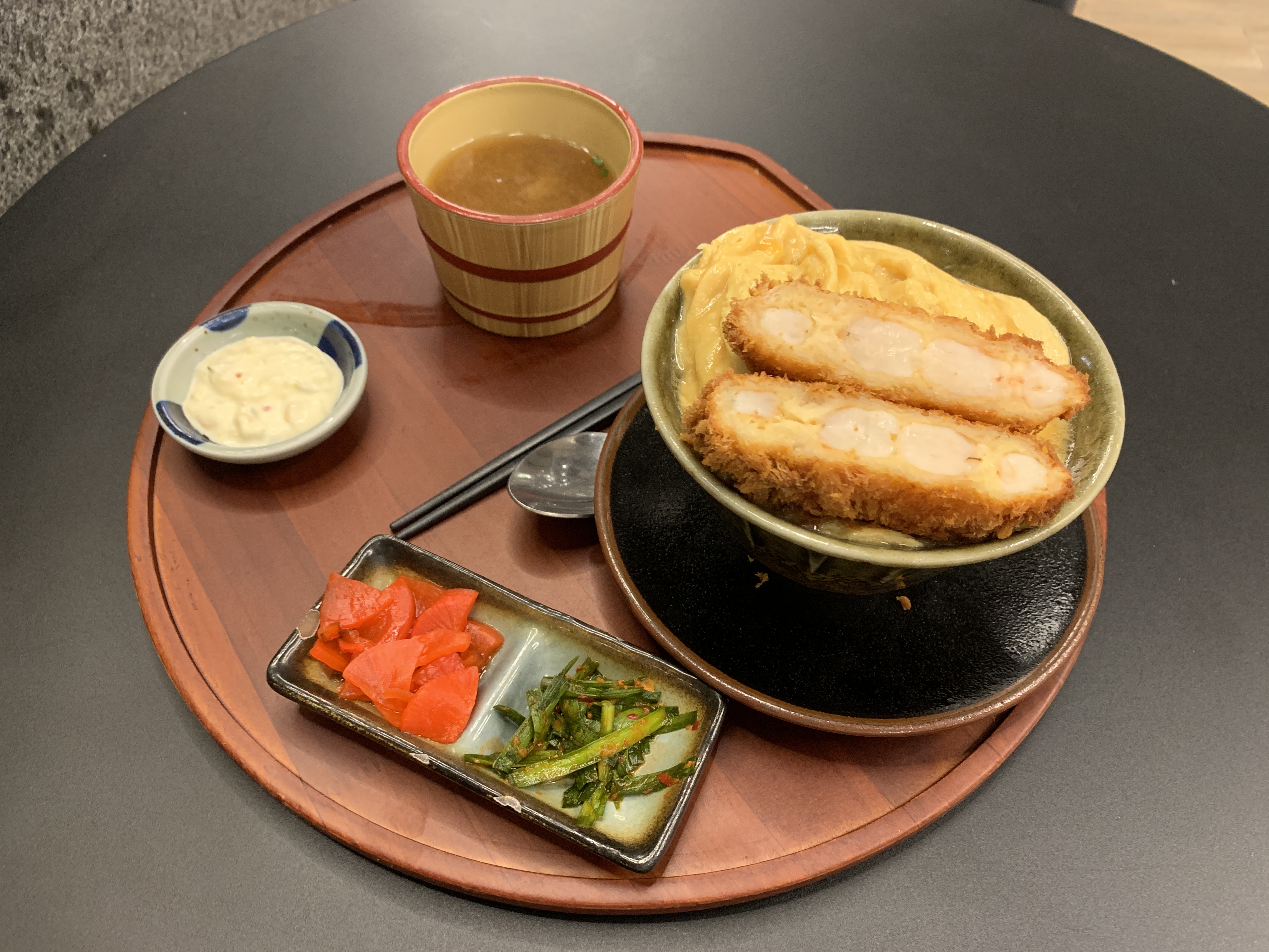 맨 위에는 두툼한 통 새우카츠가 반으로 나뉘어 올라가 있어요!