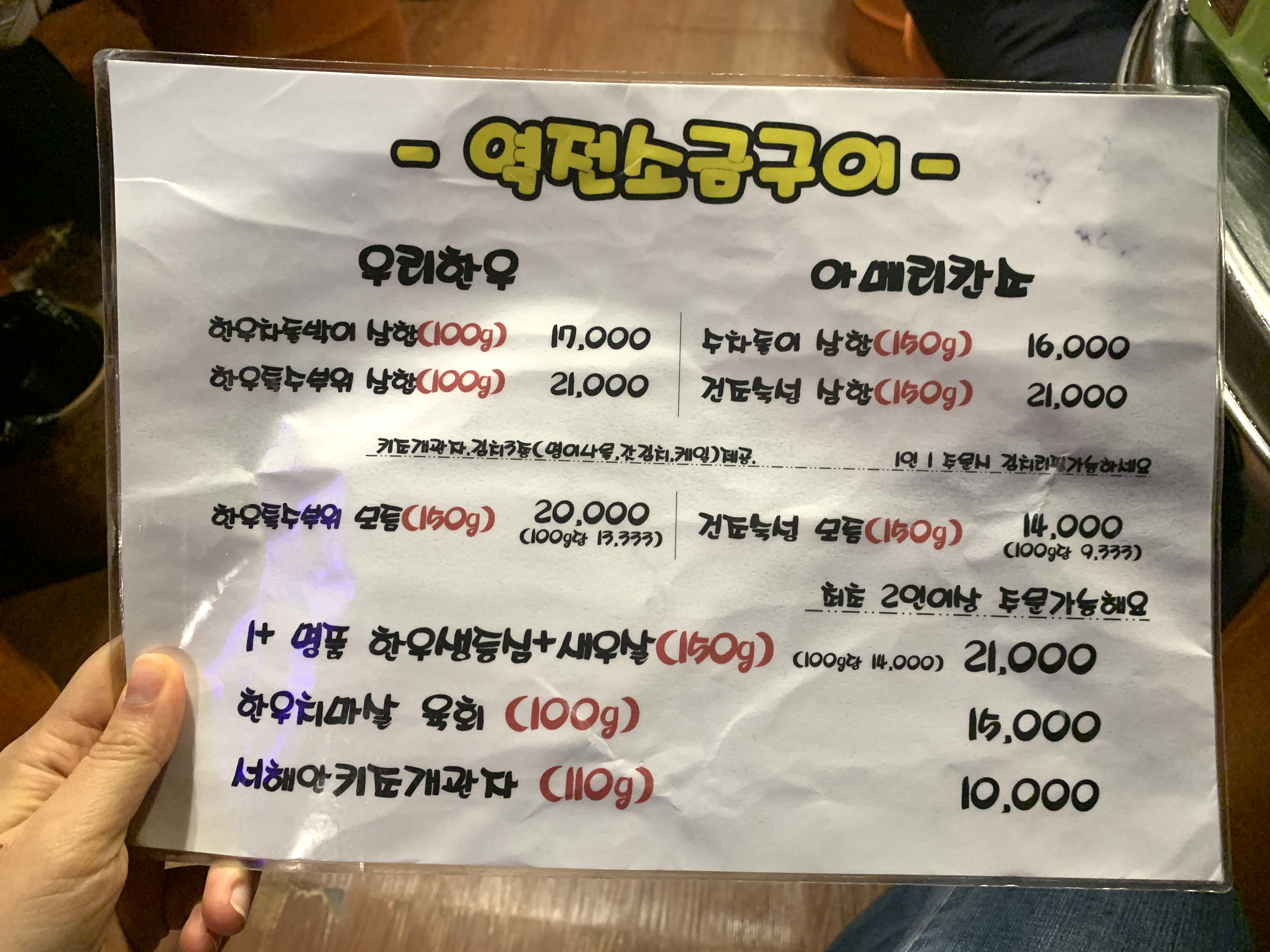 우리한우와 아메리칸 소로 나뉘어 있는데, 가격차이가 거의 없어서