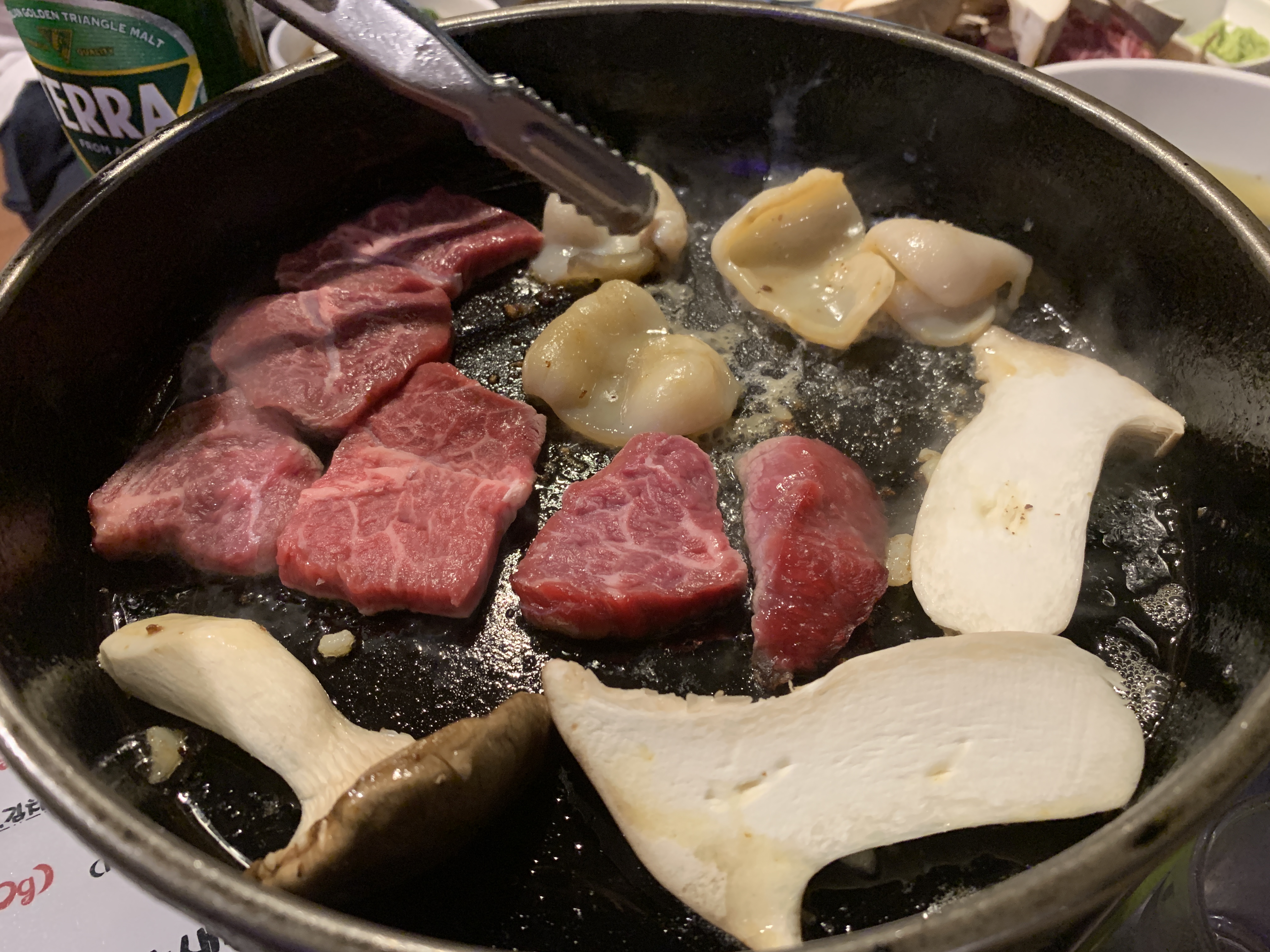 그 뒤에 고기와 관자, 버섯을 굽는다는 거에요.