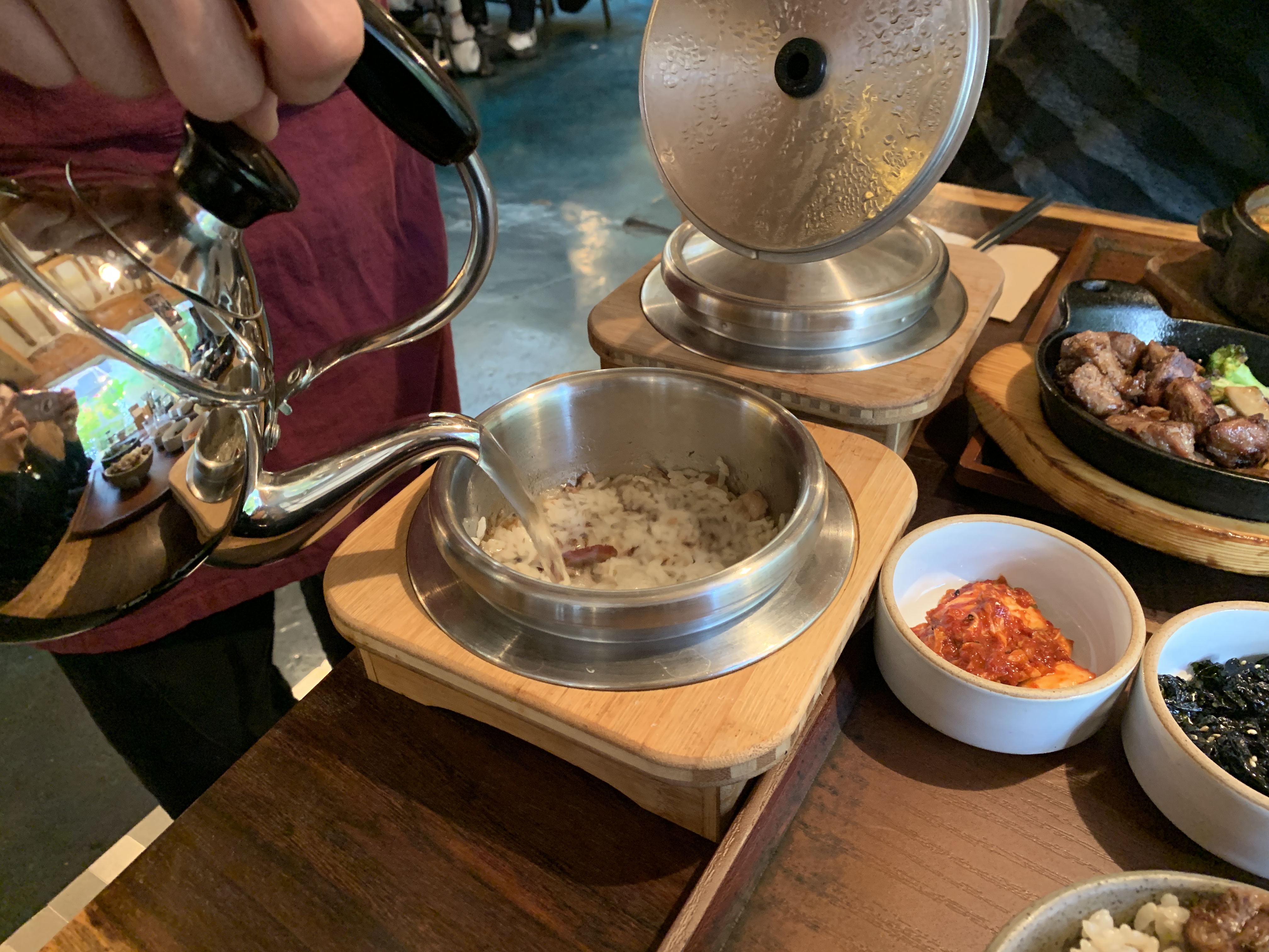솥밥뚝배기에 물을 부어 누룽지를 만들어준다.