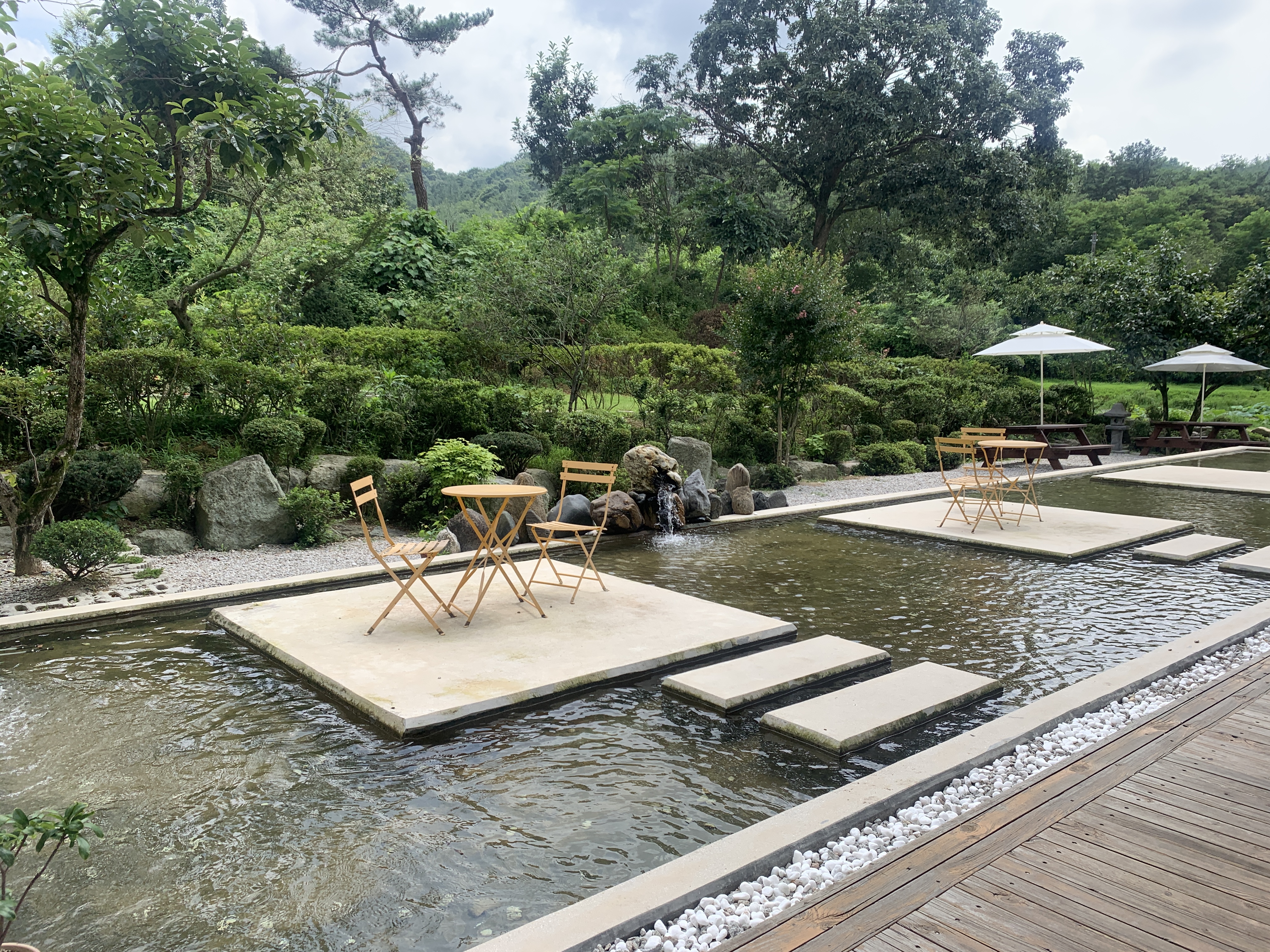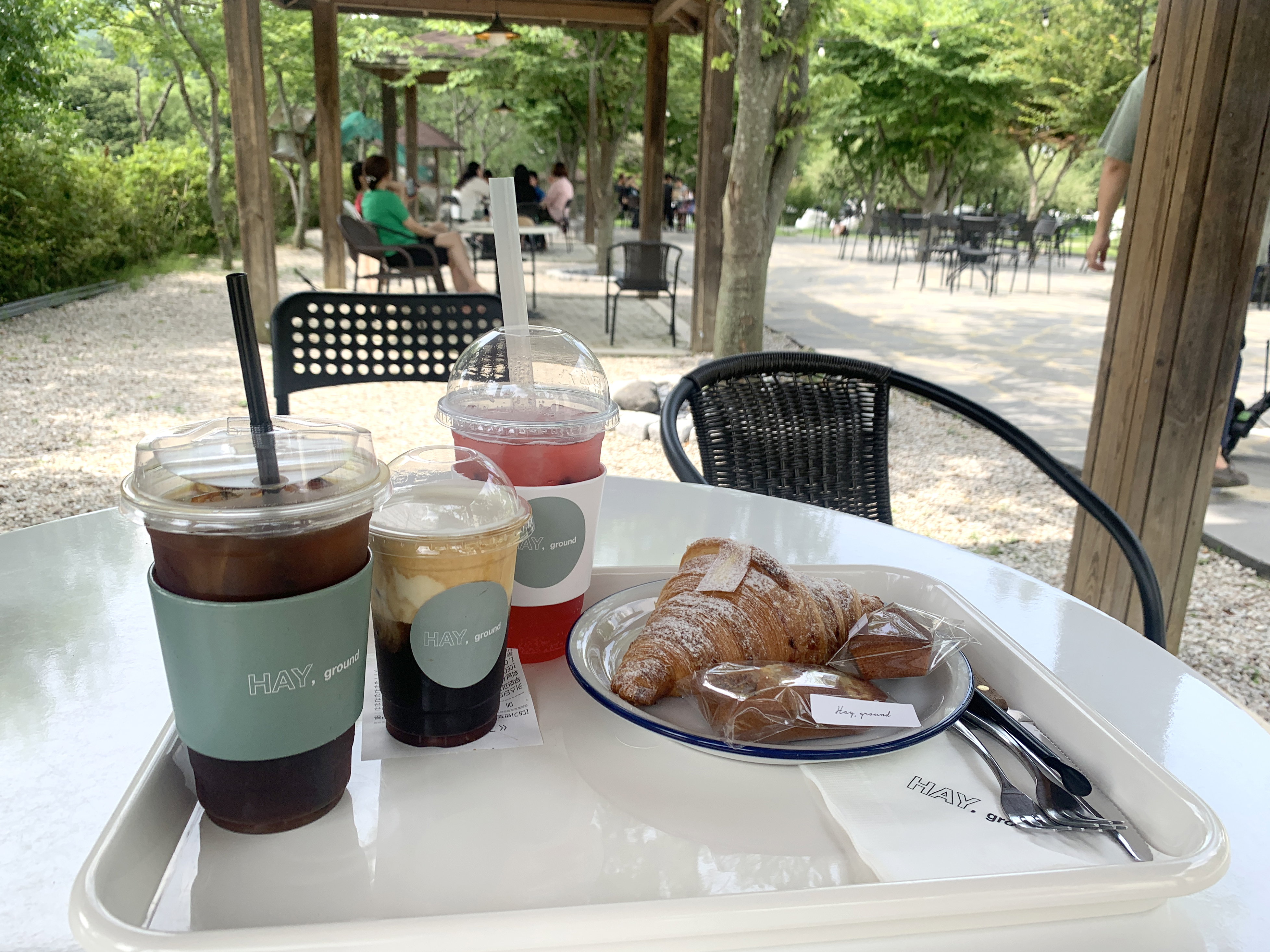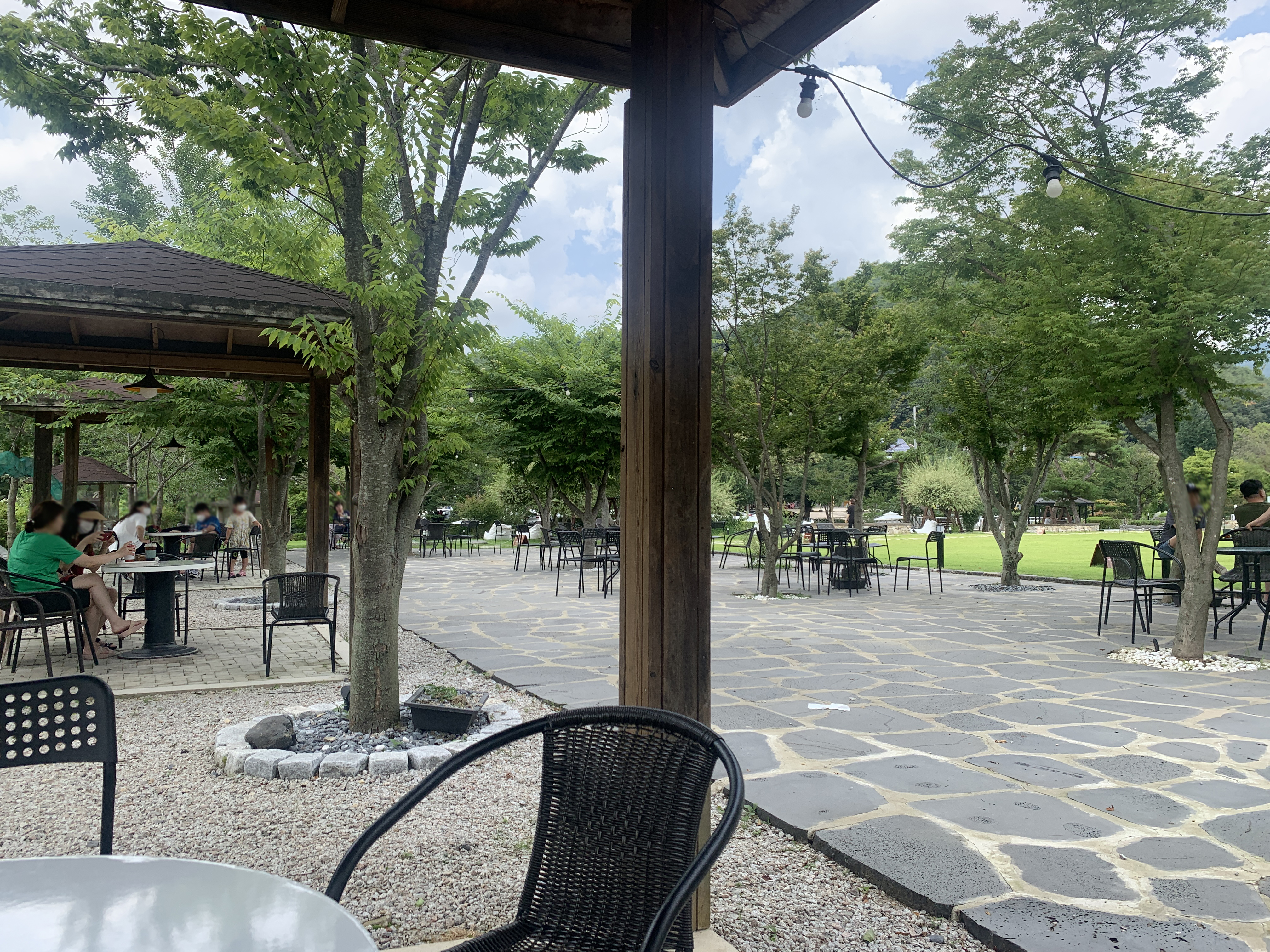 야외에 자리 잡은 테이블로 왔어요.