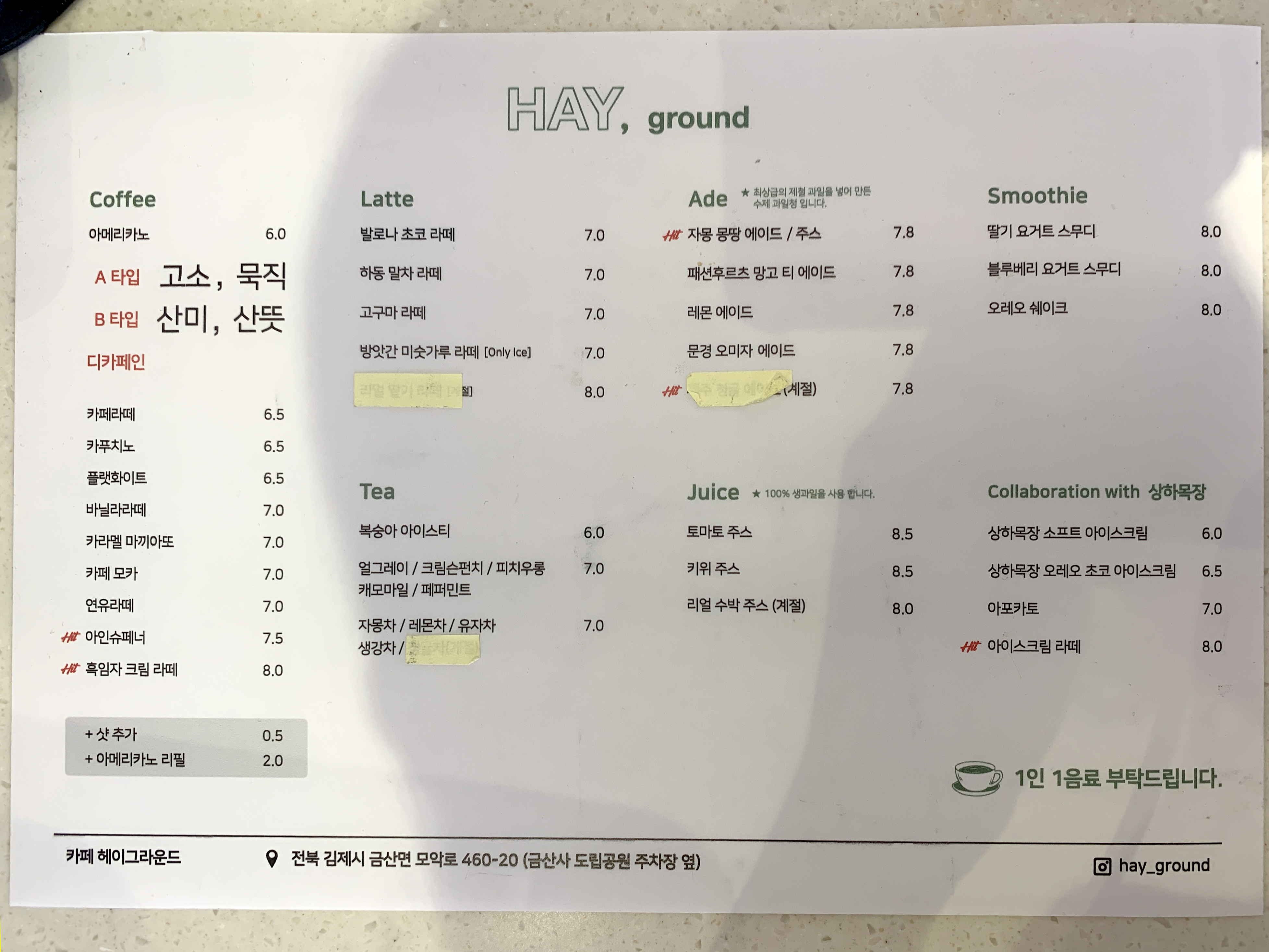 메뉴 및 가격표