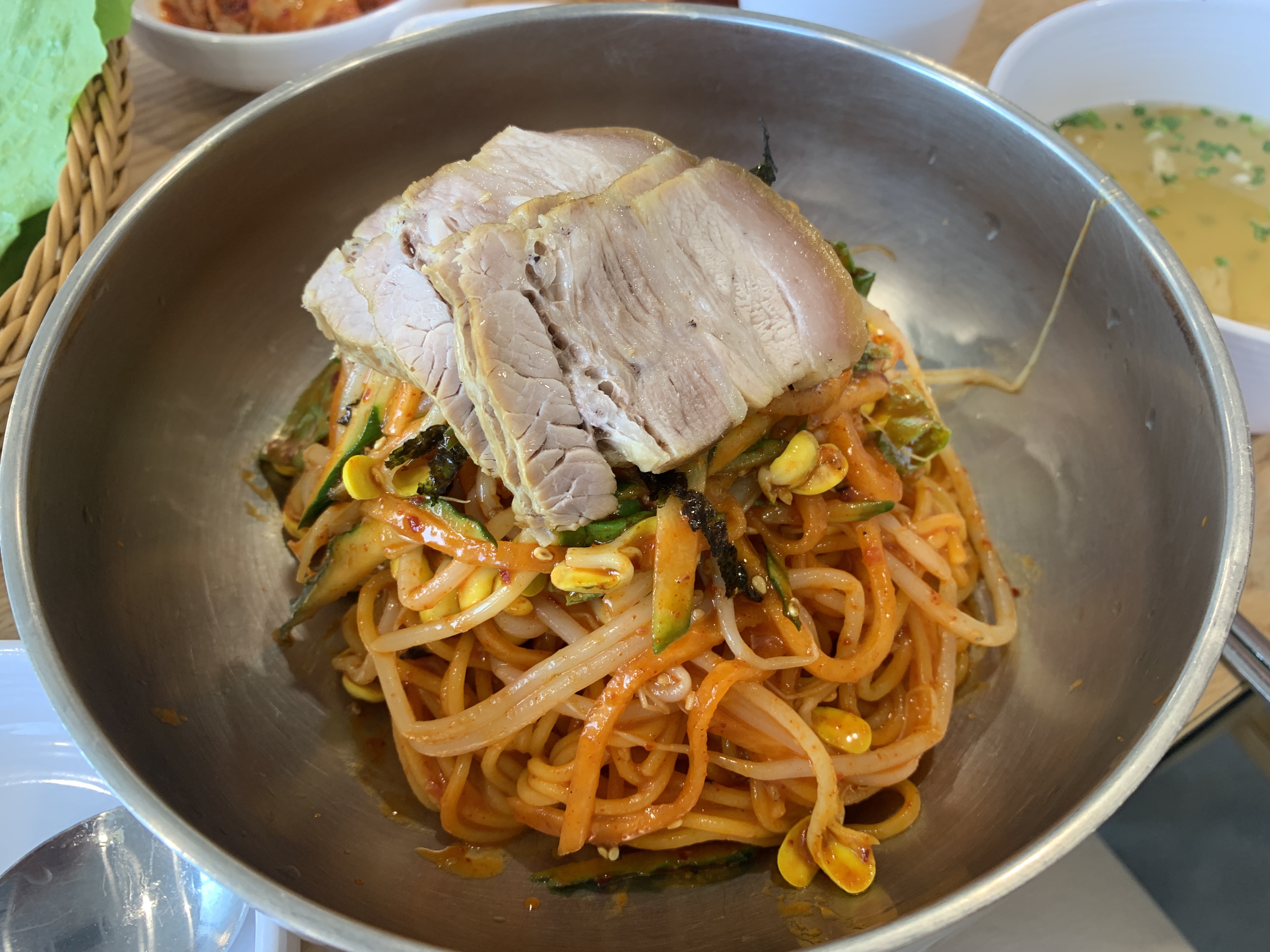 비빔국수 위에 역시나 돔베고기가 몇 점 올려나옵니다.