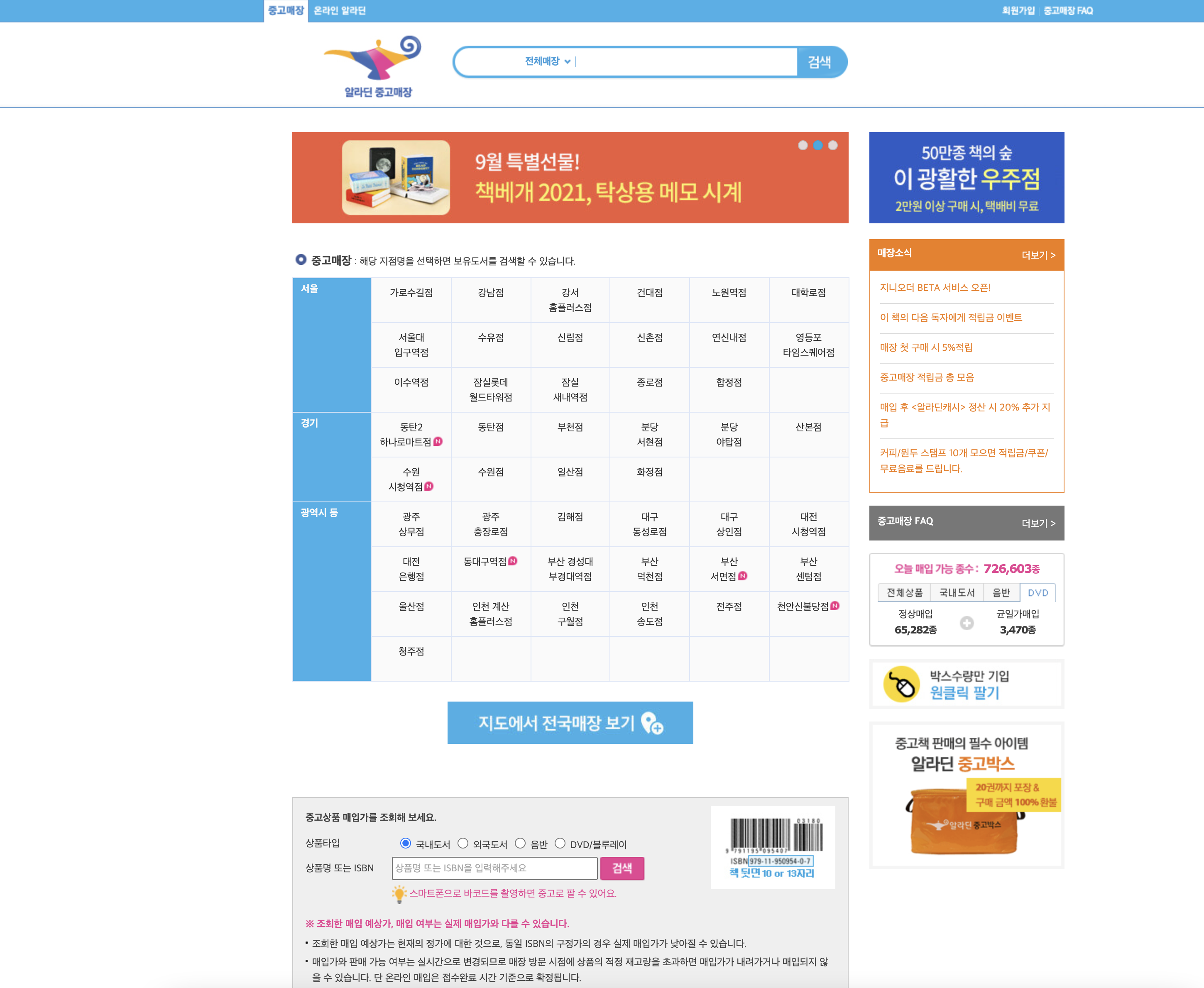 하단의 링크로 알라딘 중고서점 홈페이지에 가셔서 알아보실 수 있어요.