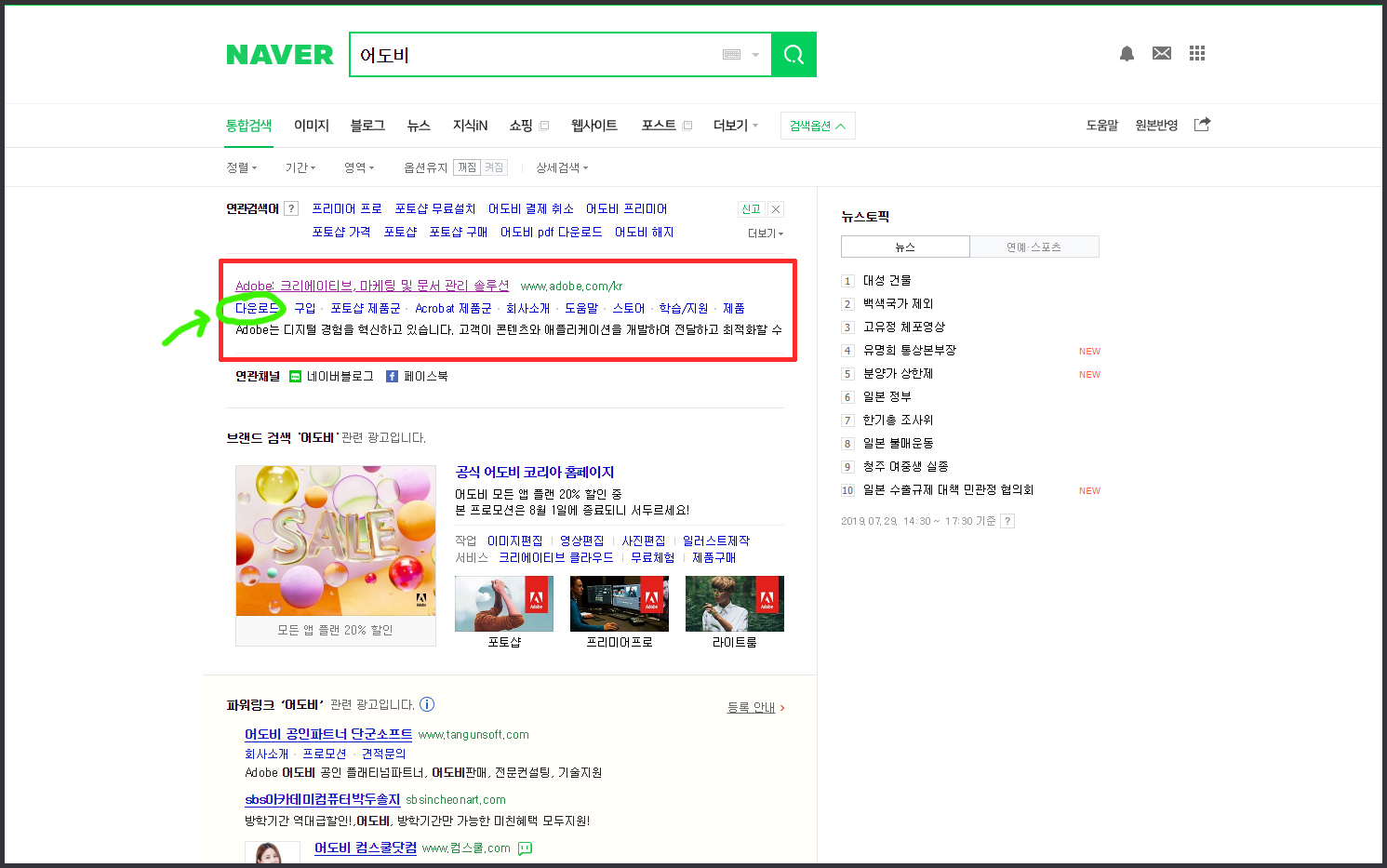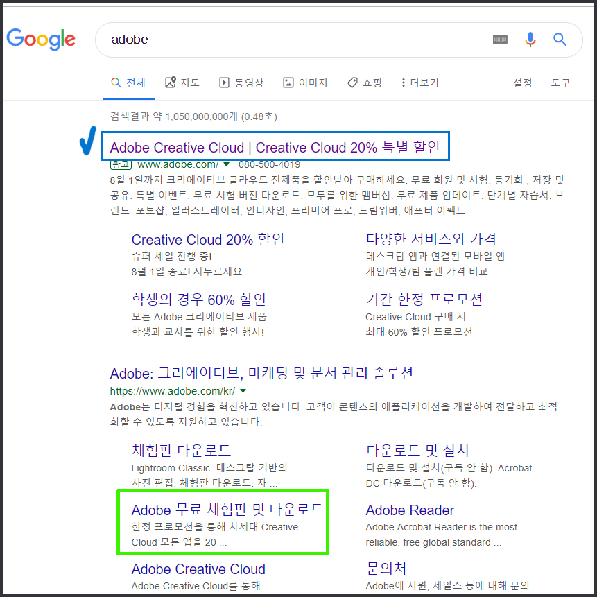 구글과 네이버에 검색했을 때, 모두 처음에 어도비 홈페이지의 링크가 뜹니다.