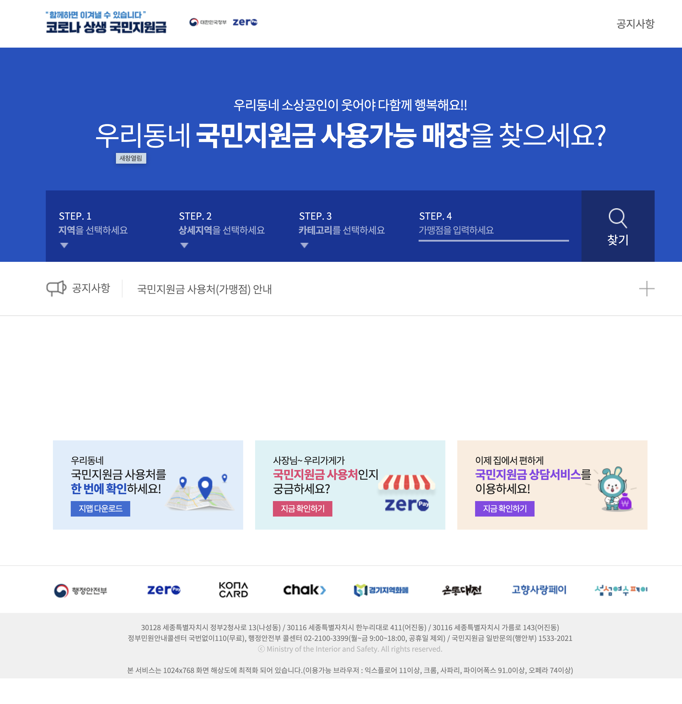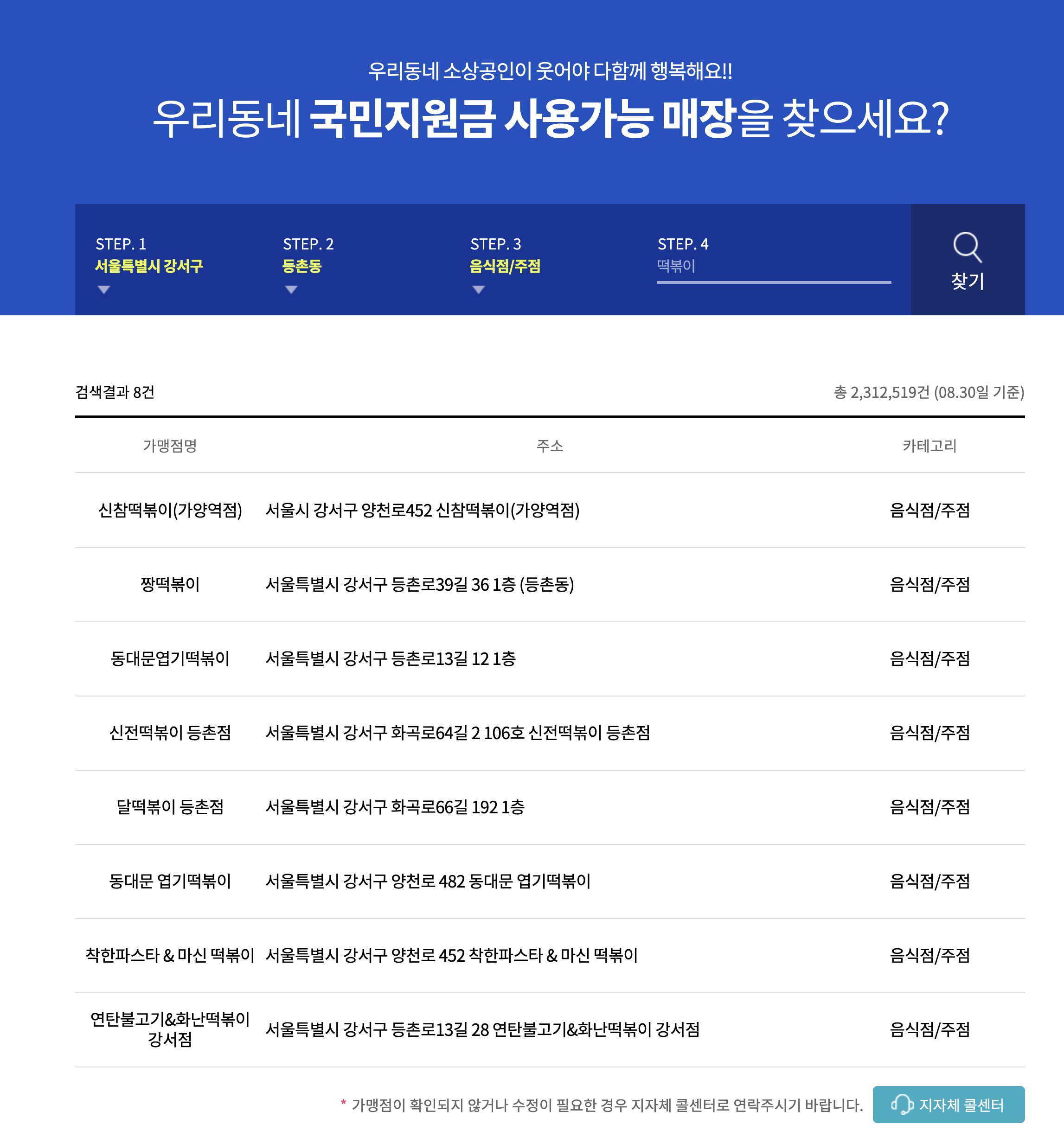살고있는 지역에서 국가재난금 결제가 가능한 매장리스트가 뜹니다.