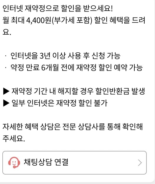 인터넷 재약정의 경우에도 월 최대 4400원까지 할인을 받을 수 있구요.